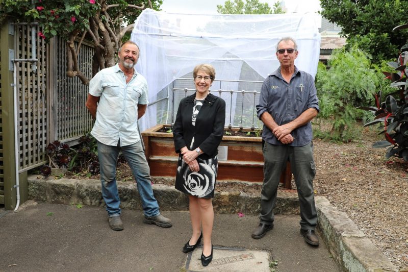 Pictured: Left Andy O’Sullivan Kimbriki wicking bed designer, middle Her Excellency the Honourable Margaret Beazley AC QC, Governor of New South Wales, right Peter Rutherford Kimbriki’s Senior Ecologist.
