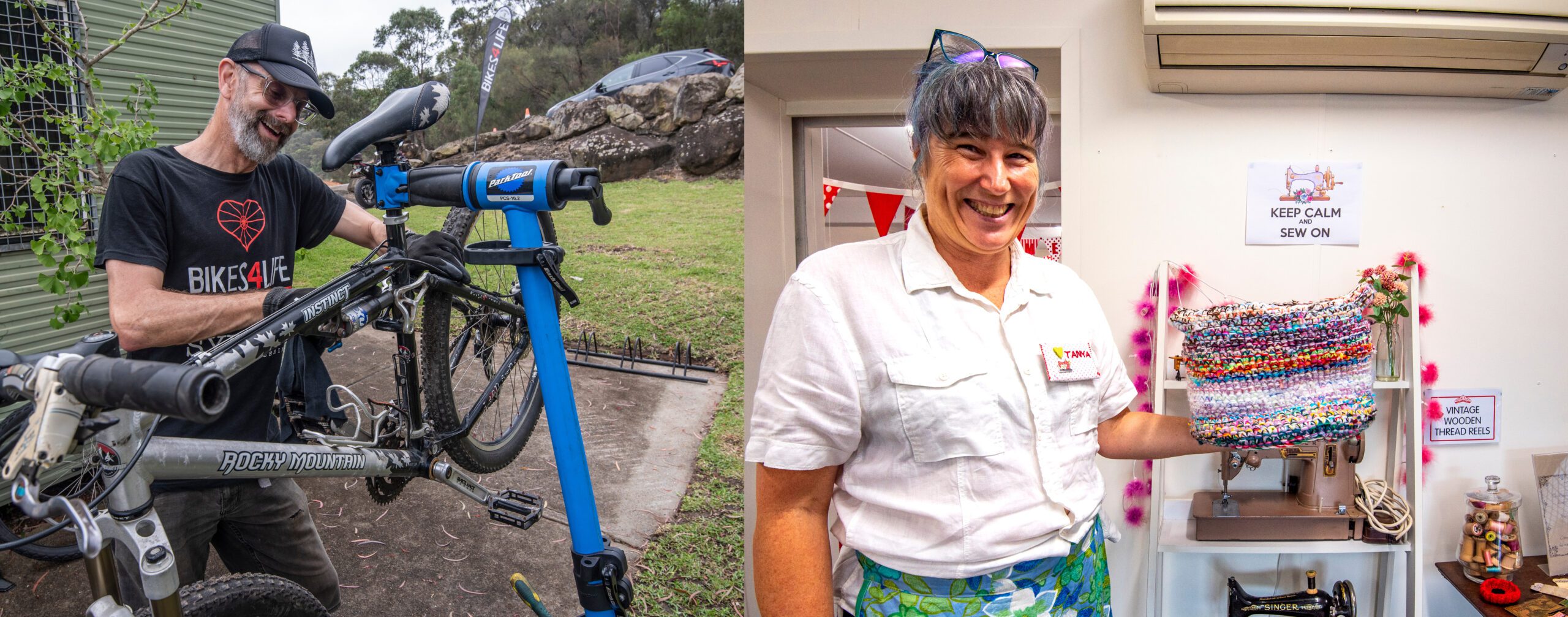 Pictured: Volunteers: Neil from Bikes4Life and Tanya from Boomerang Bags