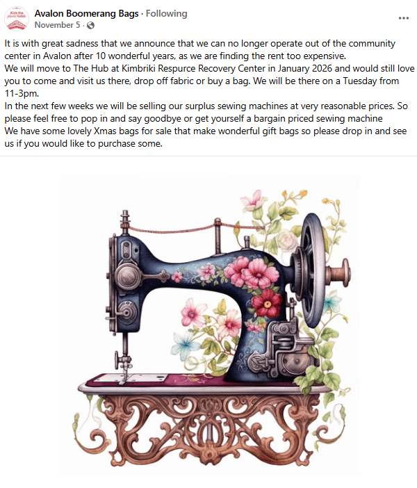 From 3rd February 2026 there will be sewing bees every Tuesday from 11am – 3pm. This will be run by our sister group from Avalon who are joining us at The Hub in 2026. This is a momentous event as Avalon were the first and are the longest running Boomerang Bags group in Sydney. We will combine our resources and skills and maintain focus on sustainability and #sewingforpurpose2026.